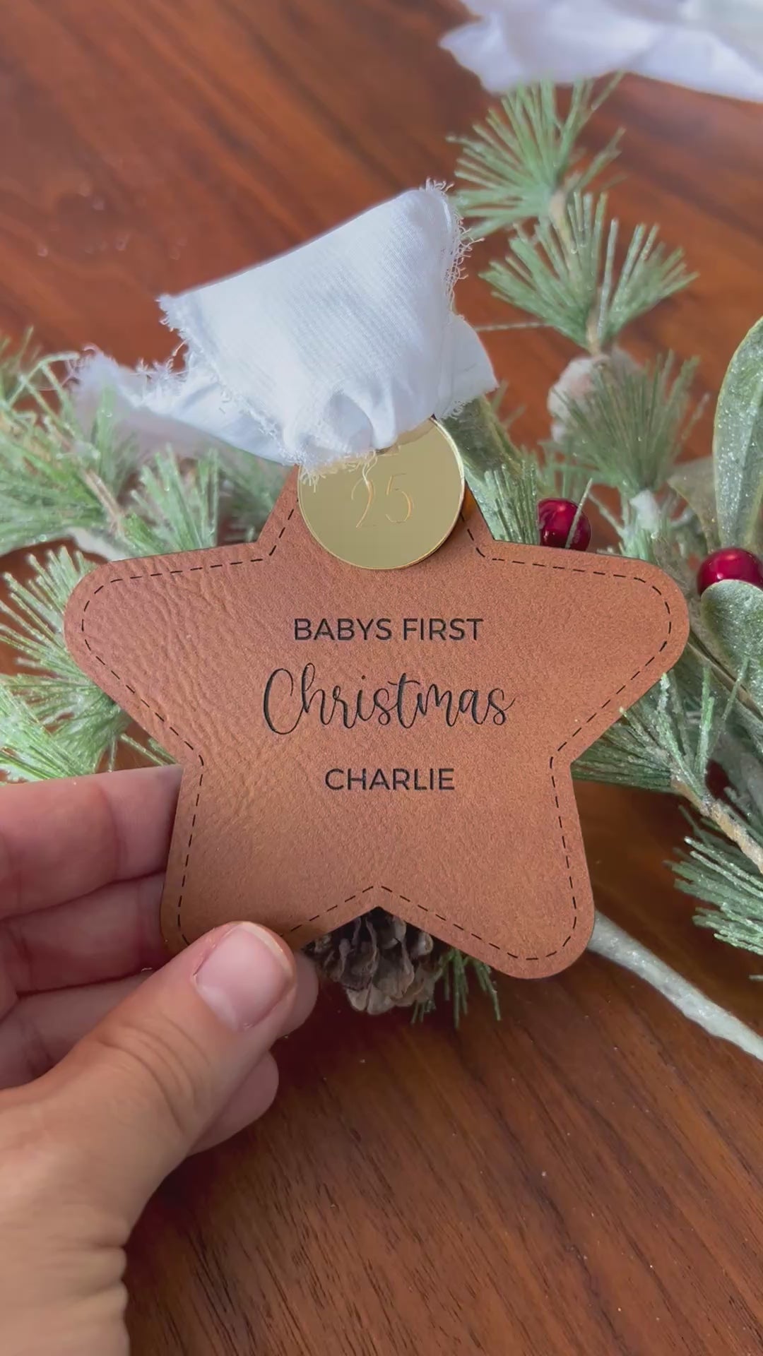 Baby's First Christmas is a wonderful time to celebrate and remember that momentous occasion. Made from Leatherette and gold mirror acrylic making for a timeless heirloom piece. Approximately 4x4 in