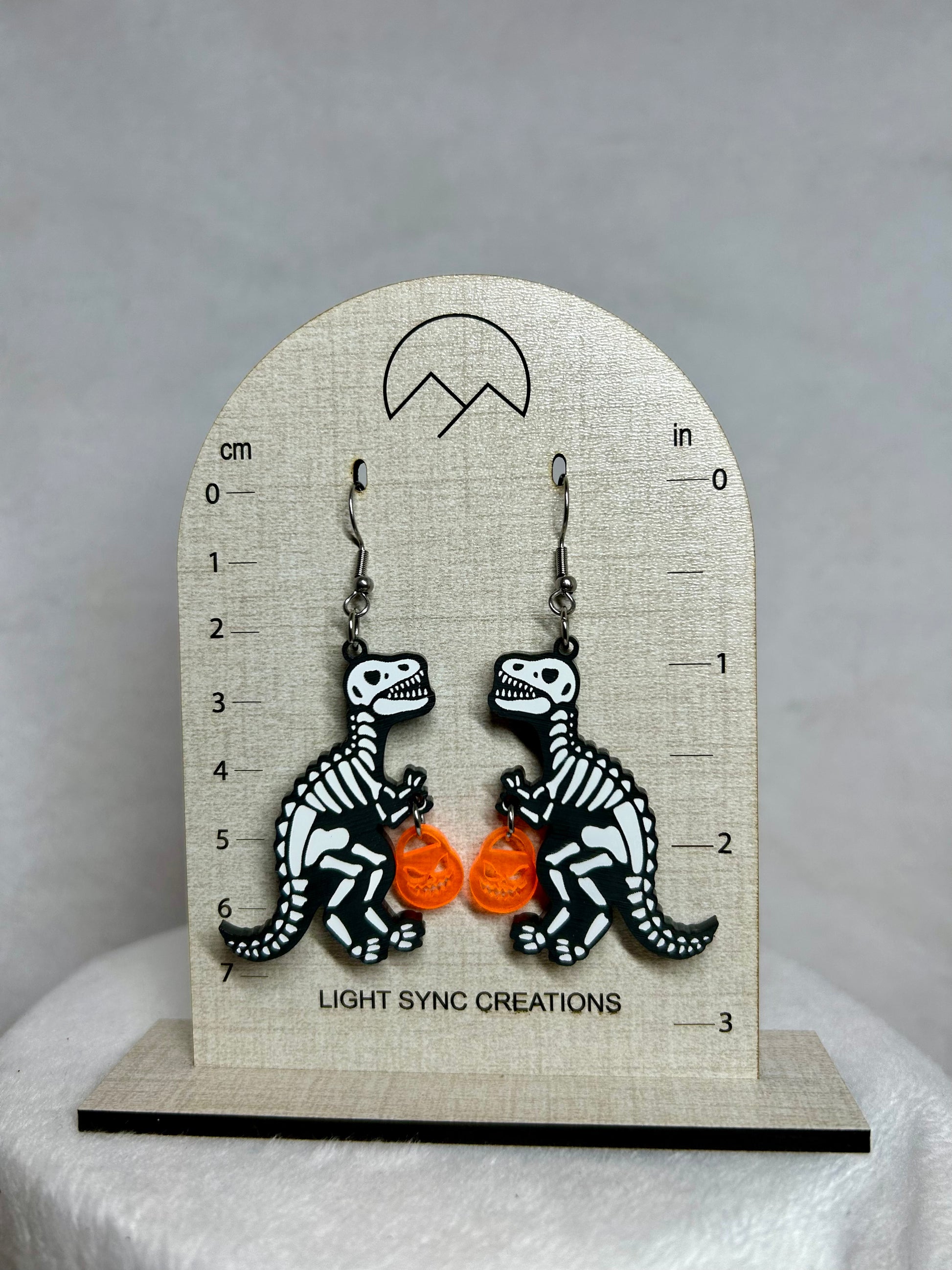 Celebrate spooky season with these playful dinosaur earrings carrying pumpkin trick-or-treat baskets! Made with hypoallergenic surgical stainless steel hooks that are tarnish-resistant, sturdy, and comfortable, these earrings are lightweight, fun, and perfect for Halloween gifting or everyday wear. Dino is made of two tone acrylic.
